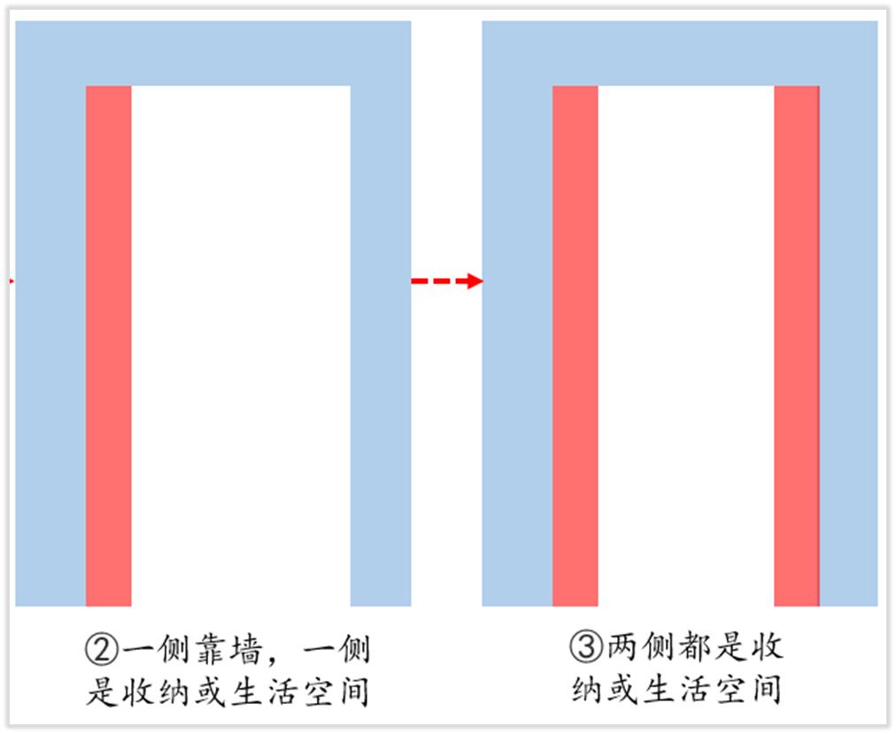 这样走道两侧都变成了收纳或生活空间,也就从第②种变成了第③种走道 。