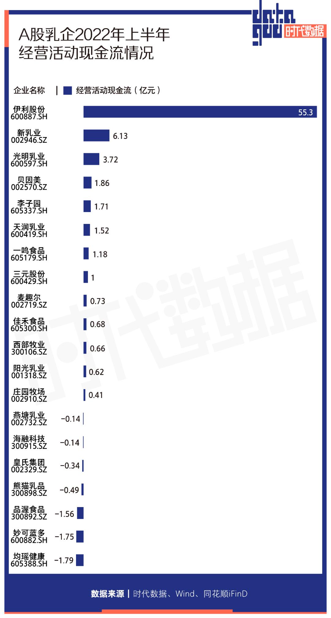 此外,另13家乳企均实现经营活动现金流净流入。其中,伊利股份(600887)、新乳业(002946)、光明乳业(600597)经营活动现金流净流入位居前三,分别为55.3亿元、6.13亿元、3.72亿元。
