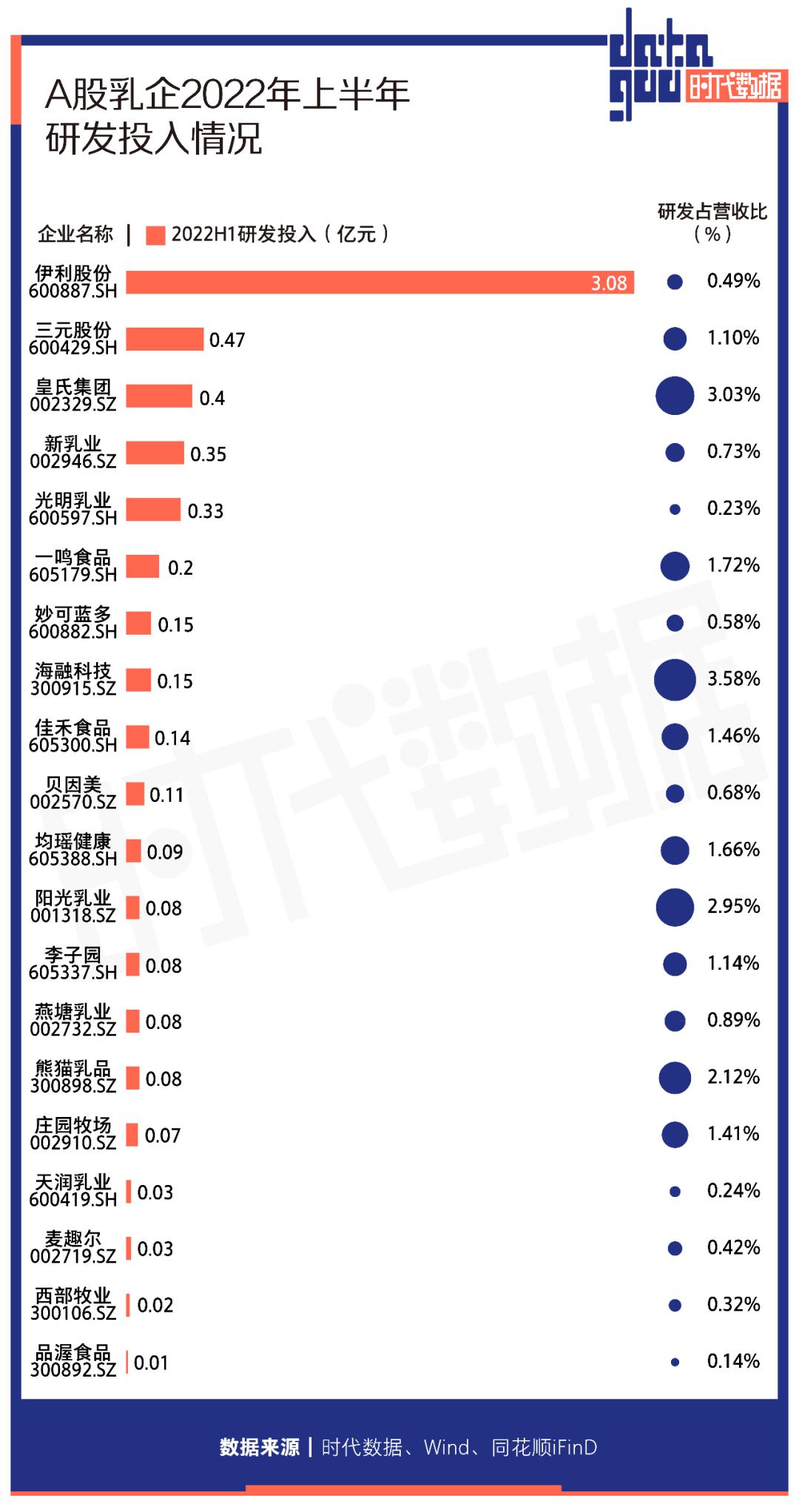 伊利股份(600887)上半年研发投入雄踞第一,达到3.08亿元,占营收的0.49%;其后,三元股份(600429)研发投入位居第二,为0.47亿元,占营收的1.10%;皇氏集团(002329)以0.4亿元研发投入位居第三,占营收的3.03%。