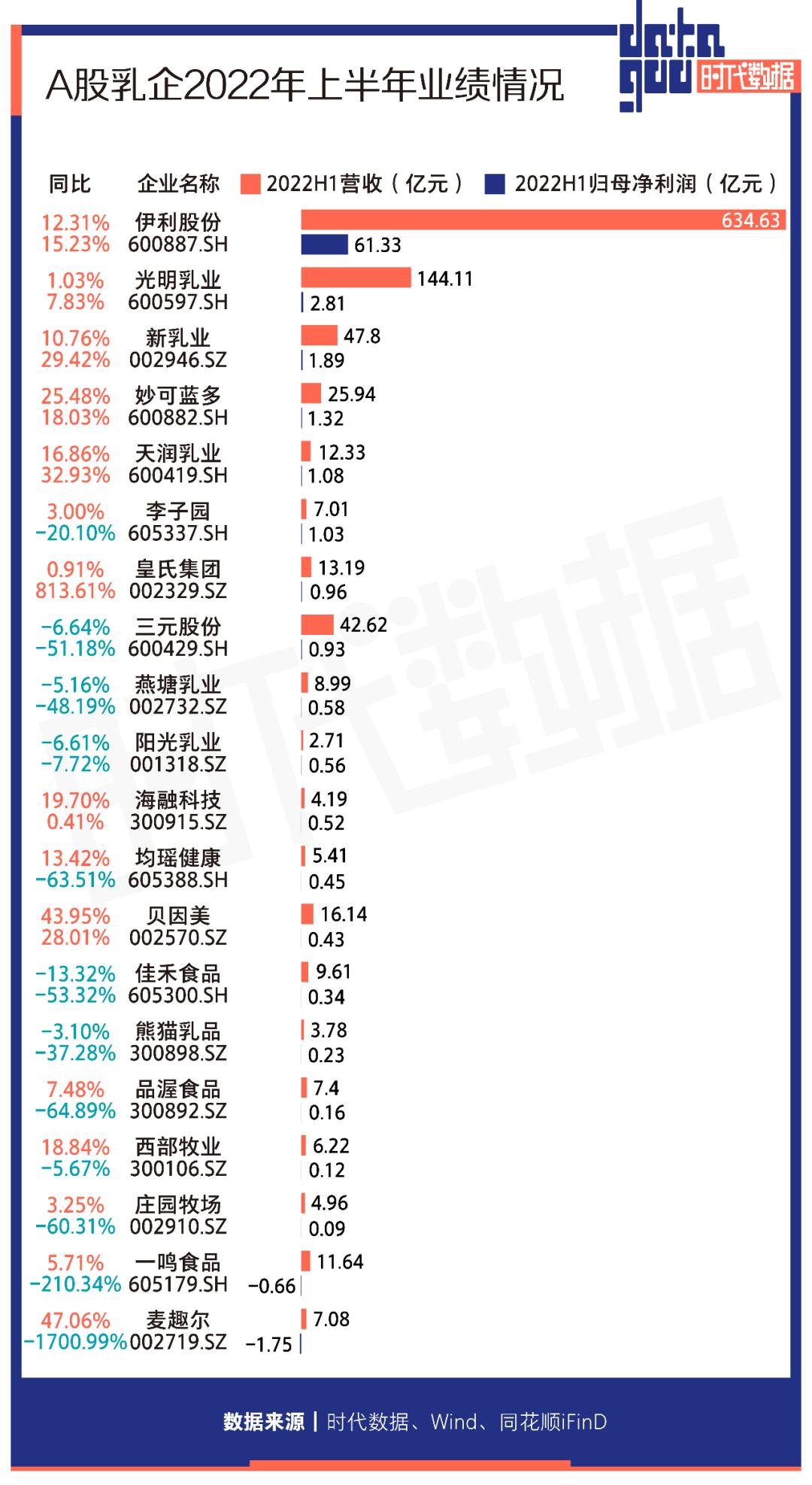 然而,中小乳企的扎堆IPO也从另一方面反映出,近年来乳制品市场原料成本的水涨船高、区域竞争的越发激烈等客观因素。从A股20家上市乳企2022 年半年度报告来看,12家企业业绩出现下滑,而另8家企业则营收净利润均同比增长。其中,伊利股份(600887)上半年业绩大幅领先,归母净利润达到61.33亿元,同比增长15.23%;皇氏集团(002329)上半年业绩大幅增长,归母净利润0.96亿元,同比大幅增长813.61%。