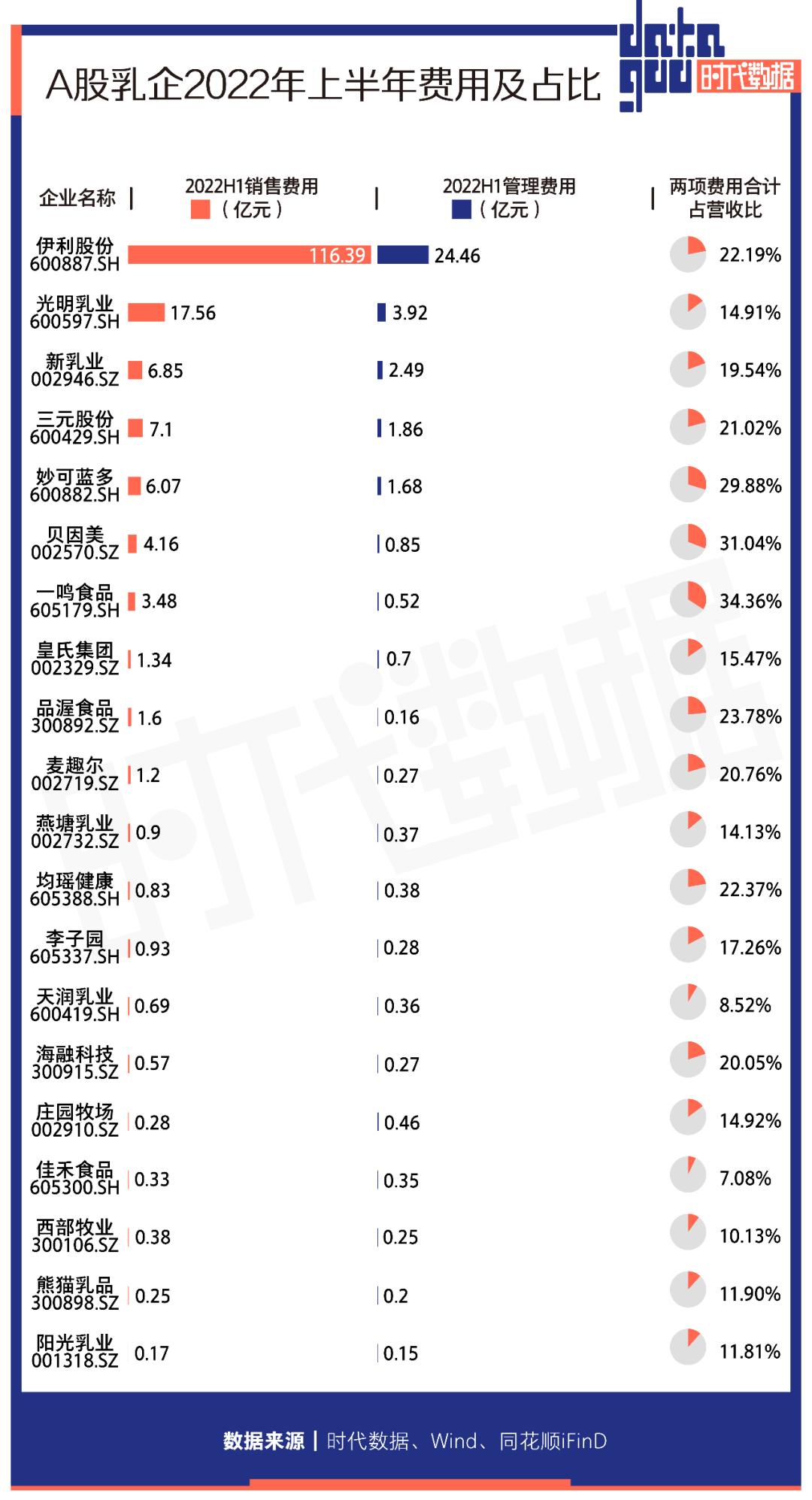 从A股乳企销售及管理费用来看,伊利股份(600887)、光明乳业(600597)、新乳业(002946)今年上半年的销售及管理两项费用合计位居前三,分别达到140.85亿元、21.48亿元、9.34亿元,合计分别占营收比22.19%、14.91%、19.54%。