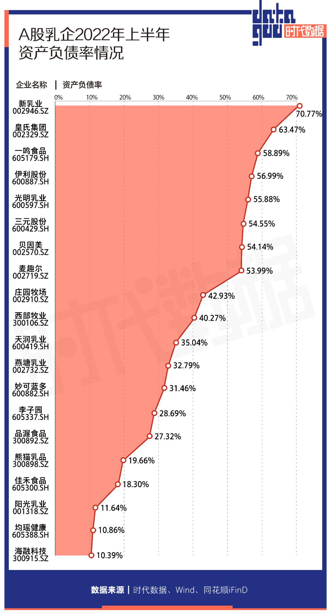 据时代数据统计,A股乳企今年上半年平均负债率为35.71%,负债率超过平均负债率的公司有10家。其中,新乳业(002946)资产负债率达到70.77%;紧随其后的是皇氏集团(002329),资产负债率达到63.47%。
