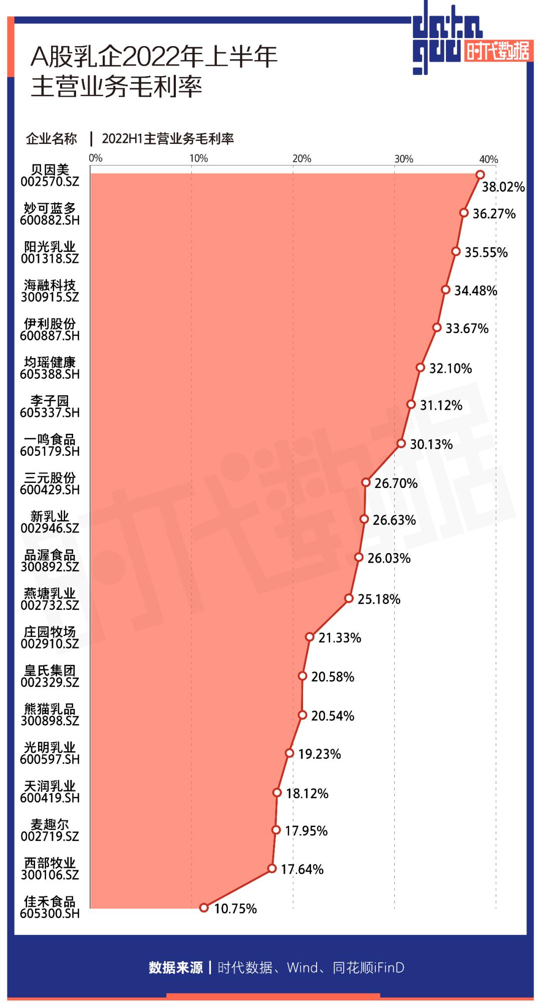 从A股乳企主营业务毛利率来看,今年上半年平均毛利率为26.1%,其中10家公司主营业务毛利率高于平均值。其中,主营业务毛利率最高的是贝因美(002570),达到38.02%;妙可蓝多(600882)紧随其后,主营业务毛利率36.27%;阳光乳业(001318)以主营业务毛利率35.55%位居第三。