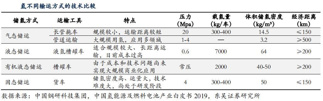 针对氢气的储存方式,主要有气氢长管拖车运输、气氢管道运输和液氢槽罐车运输。目前 300km以下的短距离运输,液氢管道运输成本和气氢拖车拥有成本优势,400km以上的长距离运输则液氢罐车更具优势。