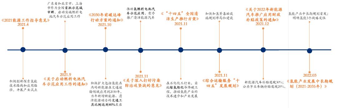 自上世纪90年代初,全球重新掀起了燃料电池的研发热潮,我国也开始大力支持燃料电池的研发。2019年,氢能首次写入政府工作报告,2022年3月,多部门联合印发《氢能产业发展中长期规划(2021-2035年)》发布,明确支持氢能全产业链发展。此外,今年(2022年)已有多项文件明确提出支持氢能发展的政策,氢能产业发展将在政策扶持下不断加速。