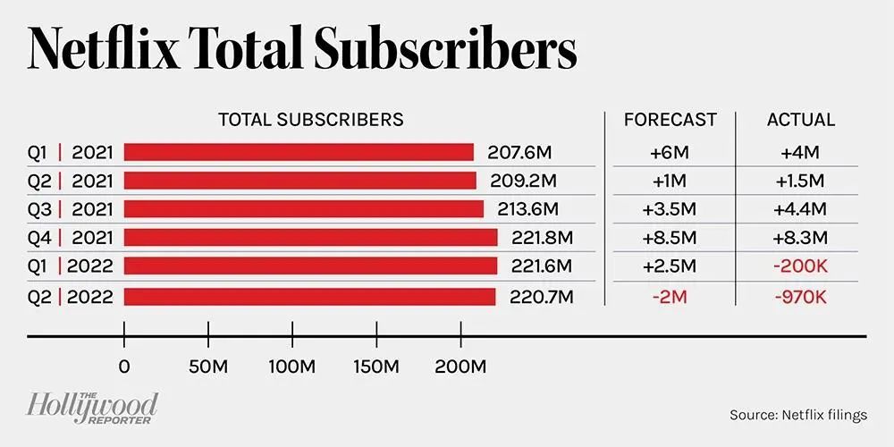 今年第一季度Netflix,公司流失了20万付费订阅用户,为十年来首次出现用户负增长。财报公布当日,Netflix股价暴跌35%,市值蒸发500亿美元。结合第二季度的情况,2022年上半年也是Netflix首次出现连续两季度用户流失。