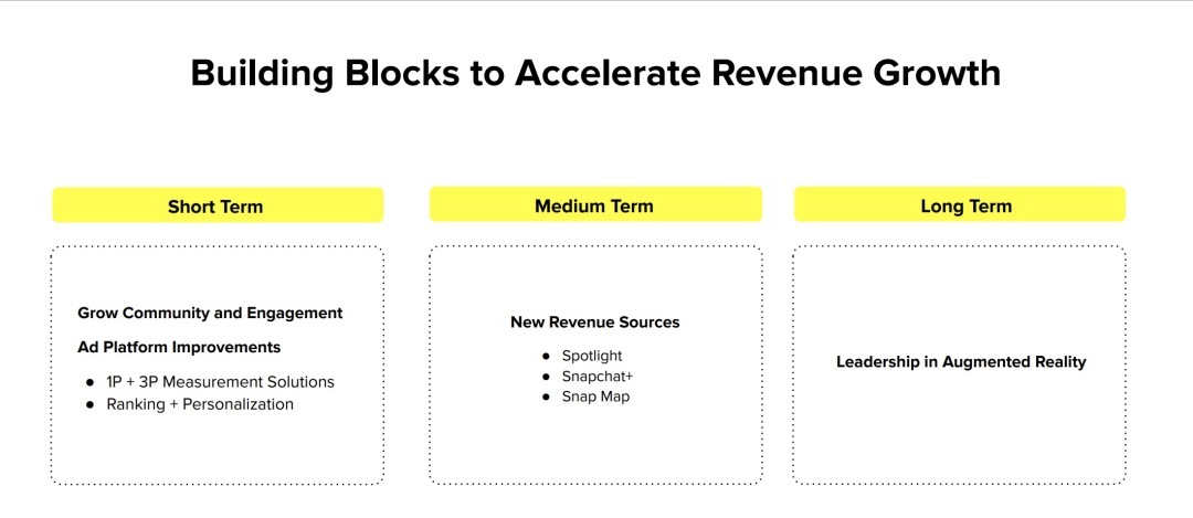Snap在一份投资者报告中,设定了短期、中期和长期的发展规划,在这三个阶段,Snap分别看好不同的收益来源。短期内,增加用户群和用户互动是关键,而中期来看,收益来源将来自于Spotlight、Snapchat+会员、Snap地图这三大业务。Snap的长期目标,依然是引领AR市场。