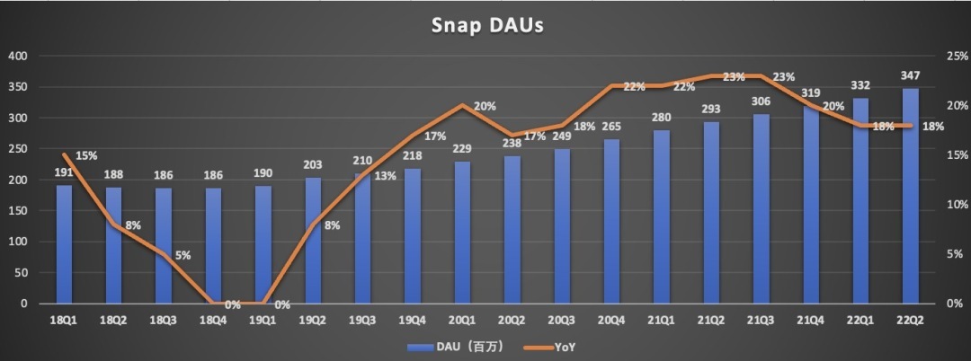 然而,好景不长,Snap的盈利未能持续,进入2022年Q1,由盈转亏的同时,每日活跃用户同比增速也在放缓。财报显示,Snapchat二季度日活用户(DAU)突破3.47亿,同比增长18%,这一增速与上一季度持平,低于上年同期23%的同比增速。