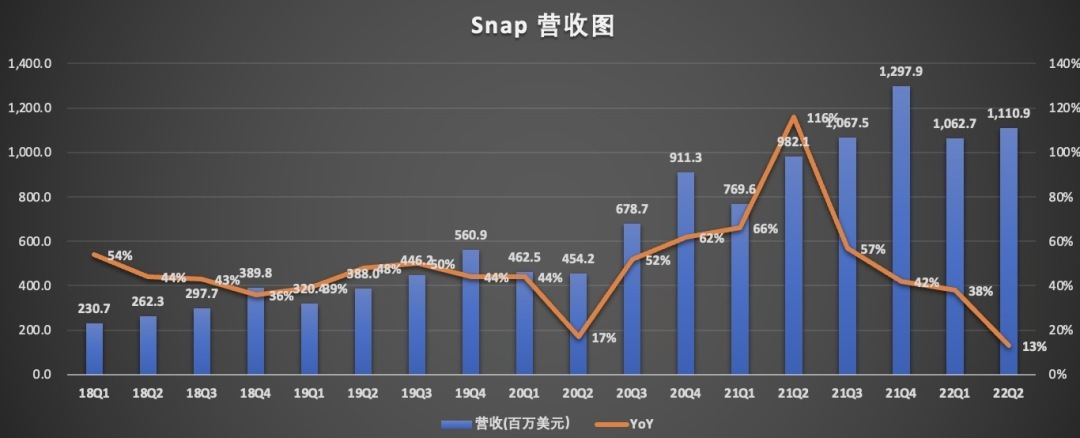 财报显示,2022年Q2,Snap季度营收为11.11亿美元,与上年同期的9.821亿美元相比,增长13%,远低于上同期116%的同比增速,以及上一季度38%的同比增速。本季度13%的同比增速,创18个季度以来最低增速。