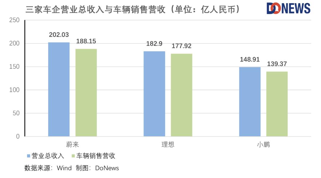 财报显示,今年上半年,蔚来营收在三家车企中最高,达到202.03亿元(人民币,下同),车辆销售营收为188.15亿元。其次是理想与小鹏,营收和车辆销售营收分别是182.9亿元、177.92亿元;148.91亿元、139.37亿元。