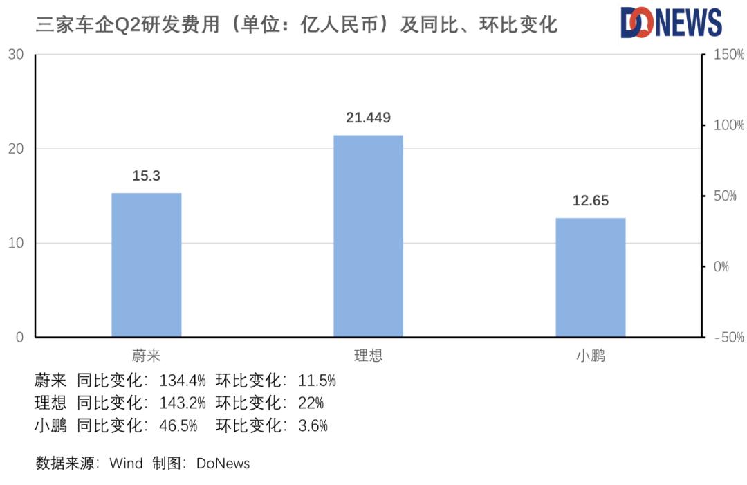 今年,造车新势力均加码研发投入,其中,小鹏Q2研发费用12.65亿元,同比增长46.5%,环比增长3.6%。理想Q2研发投入21.449亿元,同比增长143.2%,环比增长22%。蔚来Q2研发费用15.3亿元,同比增长134.4%,环比增长11.5%。