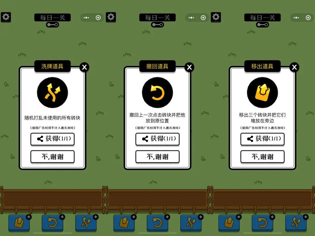 由于第二关实在难度太大,几乎大多数玩家都需要借助辅助道具来闯关,例如移出道具、撤回道具、洗牌道具。为了冲过第二关,用户们自发性地疯狂转发,让这个游戏迅速在微信扩散。