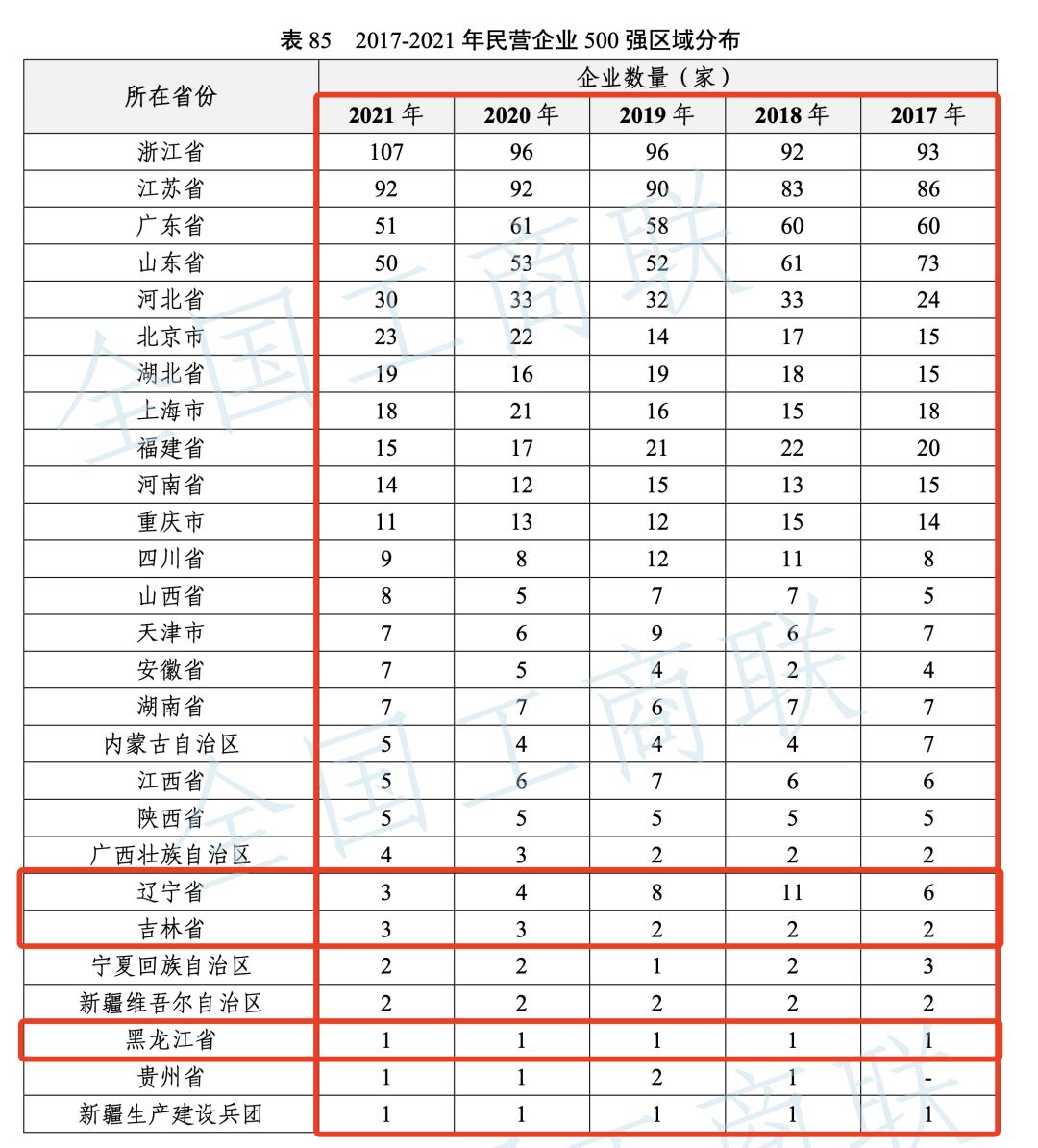 2021年,全国民企500强里,有393家企业都来自于东部地区,占比78.6%;中部地区有60家,占比12%;西部地区有40家,占比8%;东北就比较尴尬了,东三省只有7家企业上榜,占比1.40%。