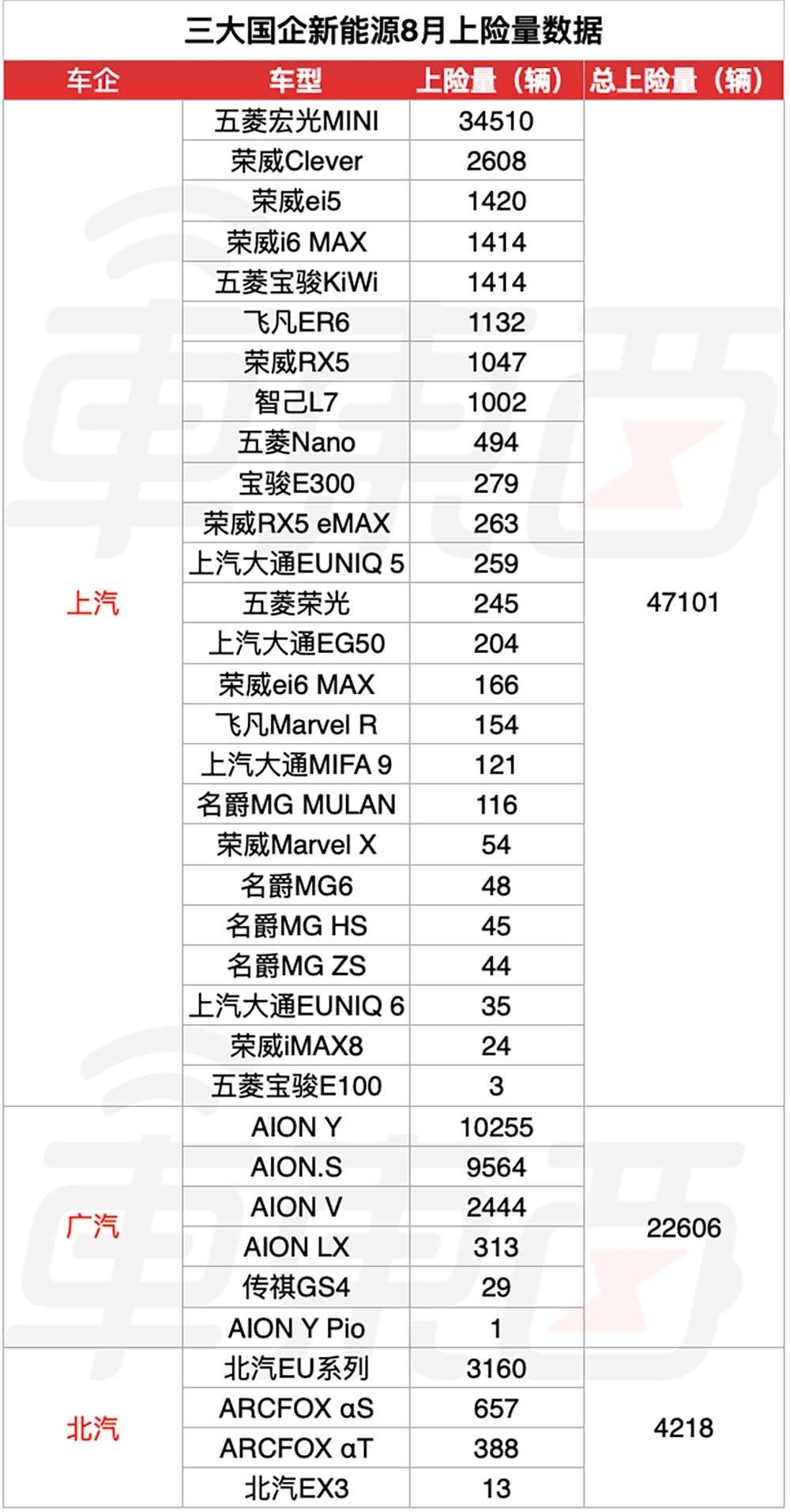 车东西统计了8月上汽、广汽和北汽这三大国企的新能源上险量后发现,虽然都是国企,但三家的新能源车销量则大相径庭。