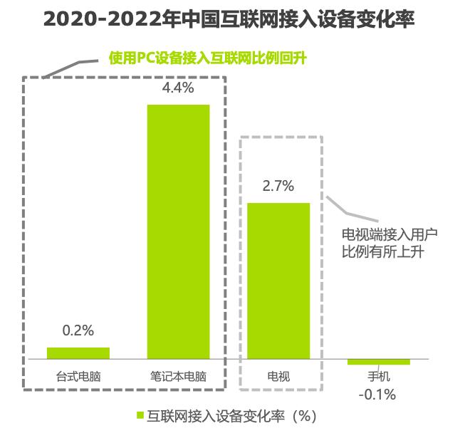 2022年-2022年中国互联网接入设备变化率,笔记本电脑上升4.4%,升幅最高,其次是电视,升幅2.7%,手机则下滑了0.1%。