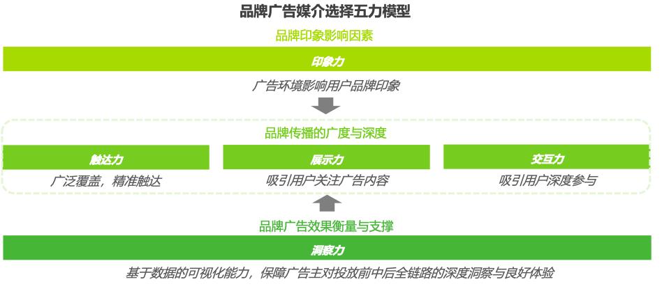 印象力(广告环境影响用户品牌的印象)、触达力(广泛覆盖、精准触达)、展示力(吸引用户关注广告内容)、交互力(吸引用户深度参与)、洞察力(基于数据的可视化,保证广告主对投放前中后全链路的深度洞察)。
