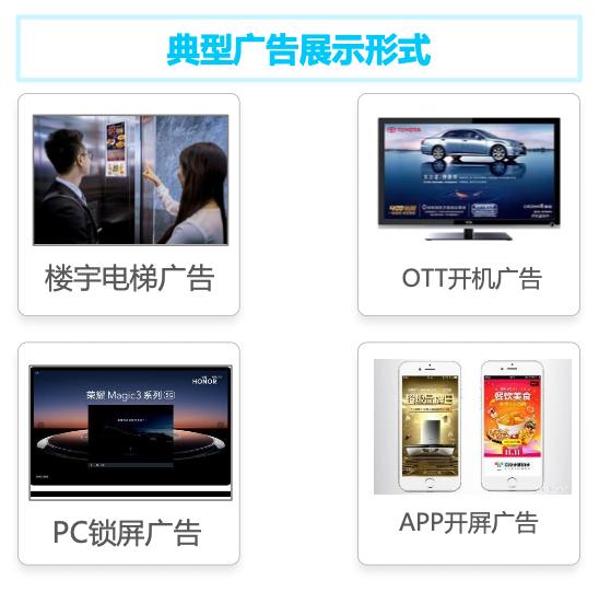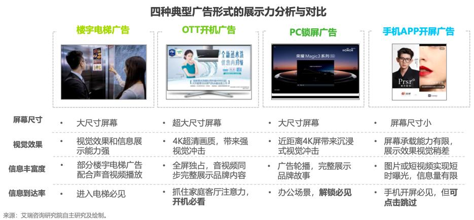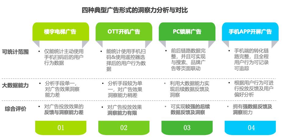 在展示力上,楼宇电梯广告、OTT开机广告和PC锁屏广告,由于屏幕尺寸都较大,展示力都好于手机APP开屏广告。