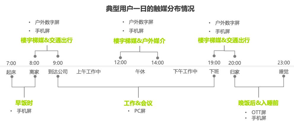 基于消费者的行动轨迹,实际上,一天的时间,PC屏的触达时间最久,尤其是在工作的8小时期间,而手机屏的频次最高,而户外电子屏和OTT屏则主要占据了上下班途中和在家的时段。