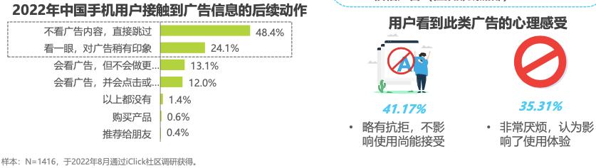 在用户心智方面,艾瑞的这份报告有点意思,虽然手机广告很强势,但“不看广告,直接跳过”的用户占到近50%,超过40%的用户在看到手机广告时“略有抗拒”,35%的用户表示非常厌烦广告。
