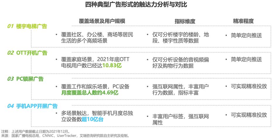 开篇提到的4块屏(户外数字屏、OTT屏、PC屏、手机屏),都在发生变化,具体体现在在用户规模、用户画像、覆盖场景和时段、触达频次、用户心智等方面。