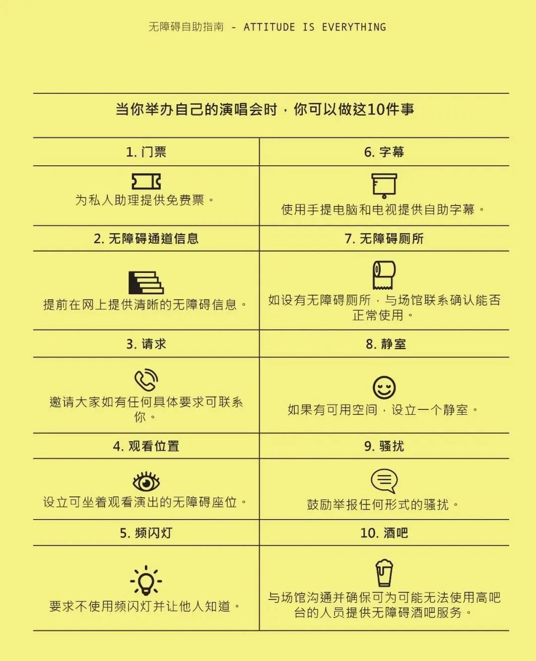 实际上,除了经济上的帮助外,识别并帮助残障群体消除进入音乐现场的障碍,更需要实用的科普知识,以保障音乐现场体验是足够人性化的、友好的和兼具包容性的。