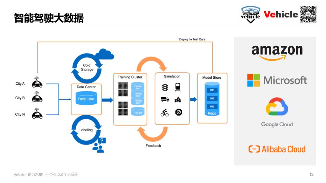 接着上文的算法,其实可以明显看出,算法的精准靠数据的喂养,而数据的整理处理离不开大数据以及处理中心,视觉时代海量数据可以想想自己1200m像素的手机拍照照片多大,而智能驾驶摄像头一般是30fps也就是一秒钟拍30张,然后再结合一般8个摄像头的360度视角这个数据量可想而知,在开发当中必须要海量存储以及超算,同时未来海量智能汽车每天还会产生数据,所以这个时候大数据的云特别重要。