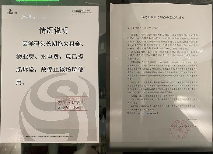 9月14日,界面新闻在洋码头总部看到,门上的一纸通知来自大楼的物业管理处,称“洋码头因长期拖欠租金、物业费、水电费,故停止该场所使用”;另一张则是来自洋码头的通知,称公司已启动总部办公地址迁移计划,目前正在评估新地址,过渡期员工以远程居家办公为主。