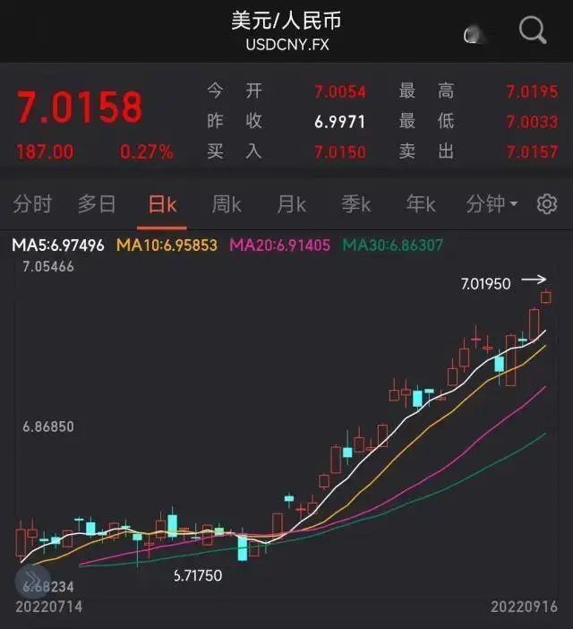 昨天,人民币离岸市场对美元汇率跌破7;今天,人民币在岸市场对美元汇率也跌破了7。这意味着,强势美元再度回归,人民币汇率走势相对较为疲软。