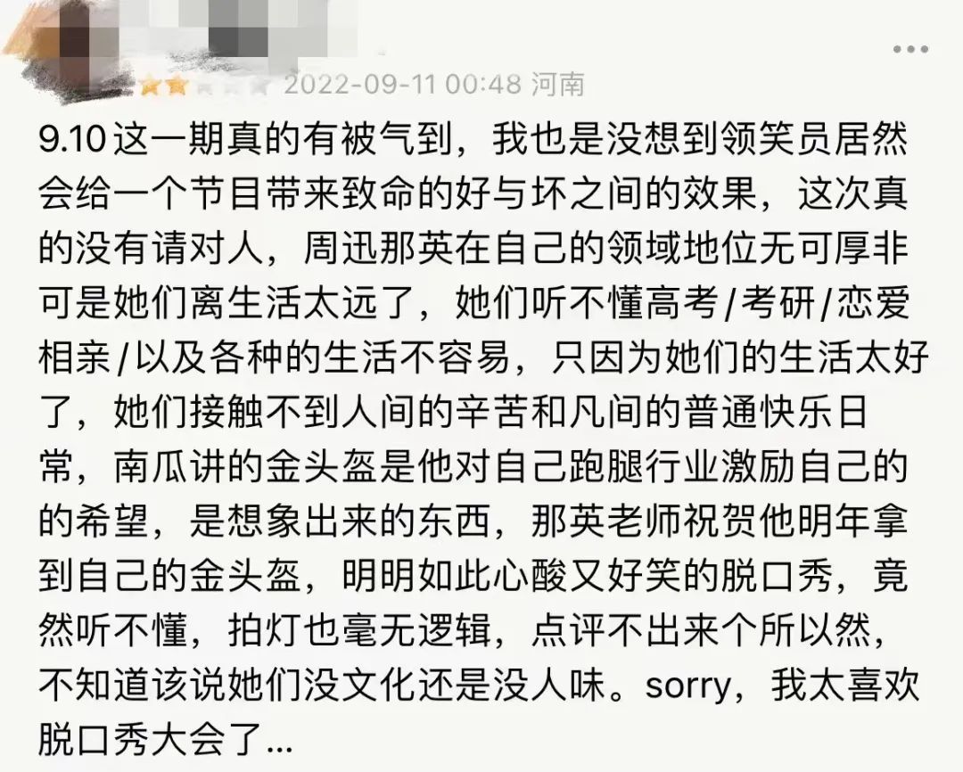 只是明星艺人的作用仍然是“一体两面”的,上一季《脱口秀大会》上,就出现了宁静、杨澜等效果“水土不服”,可以说已经埋下了隐患。这一季的周迅、那英,一定意义上是这种不满从延续到爆发。