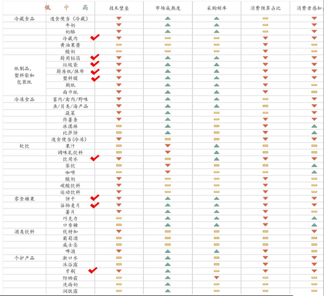 技术壁垒低,市场成熟,采购频繁,消费预算占比大,感知差异小的替代性产品成为自有品牌发展的主要切入点。