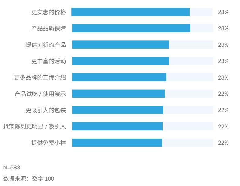 调研数据显示,而在没有购买过自有品牌的消费者中,有近9成(87%)的消费者表示愿意尝试购买自有品牌:品质保障(28%)、实惠的价格(28%)和创新的产品(23%)能提升他们的转化率。