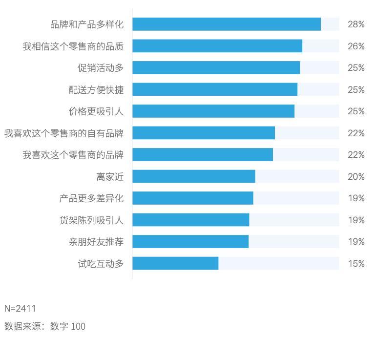 在被问到选择零售商的原因时,“品牌和产品多样性”成为消费者选择零售商的首要原因,比促销活动多、配送方便、价格吸引人等因素高出3个百分点,说明差异化是影响消费者选择零售商的最主要原因。