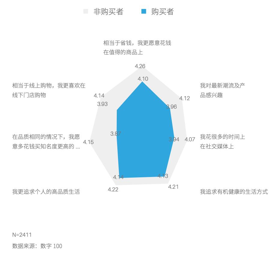 从调研数据来看,购买自有品牌和没有购买自有品牌的消费者在生活态度方面出现差异:在品质相同的情况下,我愿意多花钱买知名度更高的品牌;我对最新潮流及产品感兴趣;相当于线上购物,我更喜欢在线下门店购物。这三个方面差异度最大。