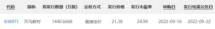天马新材9月16日北交所申购:发行价21.38元/股 发行市盈率24.99倍