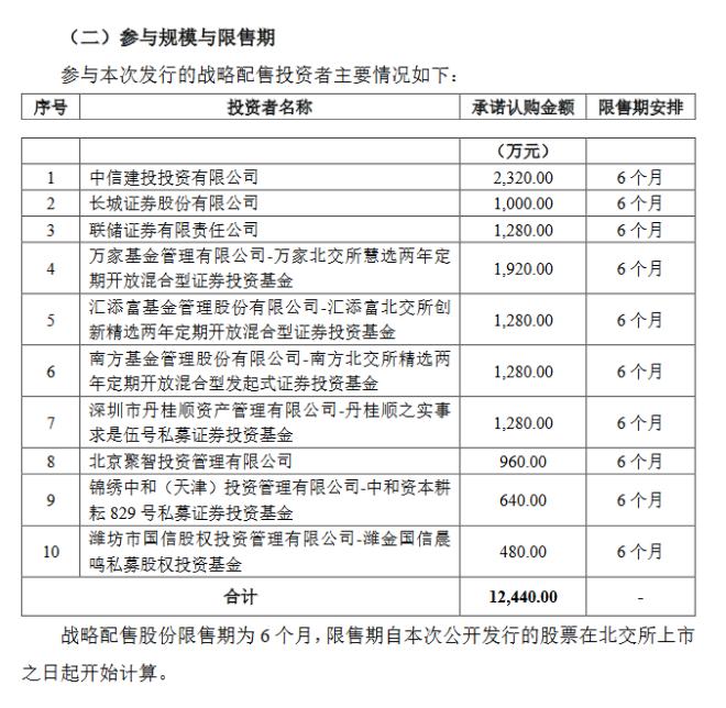 10家战投分别为:中信建投投资有限公司、长城证券股份有限公司、联储证券有限责任公司、万家基金管理有限公司-万家北交所慧选两年定期开放混合型证券投资基金、汇添富基金管理股份有限公司-汇添富北交所创新精选两年定期开放混合型证券投资基金、南方基金管理股份有限公司-南方北交所精选两年定期开放混合型发起式证券投资基金、深圳市丹桂顺资产管理有限公司-丹桂顺之实事求是伍号私募证券投资基金、北京聚智投资管理有限公司、锦绣中和(天津)投资管理有限公司-中和资本耕耘829号私募证券投资基金、潍坊市国信股权投资管理有限公司-潍金国信晨鸣私募股权投资基金。