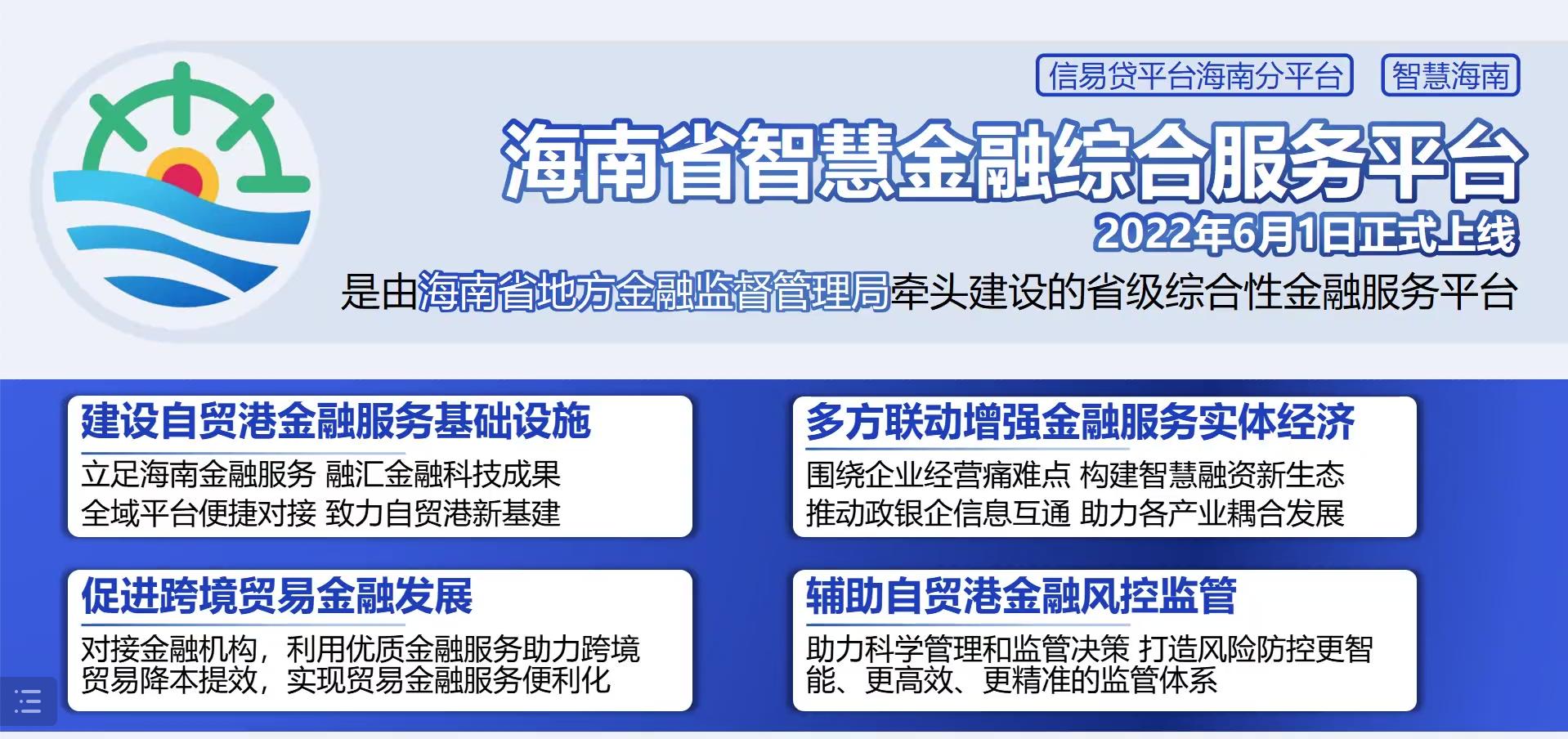 为了更加高效精准地解决海南本地企业的资金需求,本次会议也特别为企业负责人进行了海南智慧金融综合服务平台项目详解。该平台可接入全省不同金融机构产品,通过职能匹配系统,为全省中小微企业推荐符合需求的融资产品,安全便捷地解决企业申贷需求。截至今年上半年,平台已入驻各类金融机构92家,上架金融产品112款(含担保专区产品),中小微企业在平台上提出融资申请金额达11.8亿元,实现放款2.32亿元。