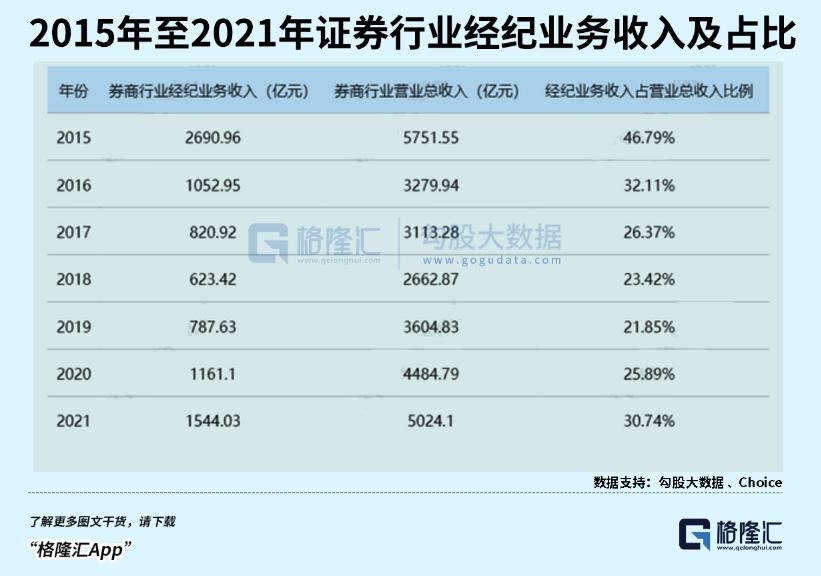 量增价减,券商经纪业务总收入最近6年仅仅上升不足50%。2021年经纪业务为1544亿元,仍然离2015年最高峰相距甚远,占比30.74%,远比不上2015年的46.79%。