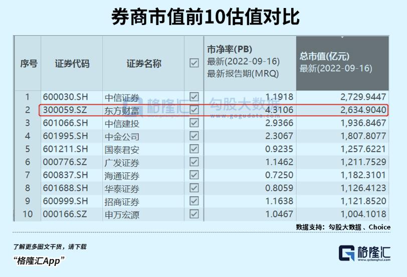 这么多年,东财几乎是唯一一家券商牛股,主要逻辑是具备其余券商并不具备的增长引擎:以基金为主的代销业务。这亦是市场给予东财高估值的核心——东财PB为4.3%,是10家千亿券商中最高的,遥遥领先于中信证券的1.19倍、中信建投的2.93倍和中金的2.3倍。全行业对比,东财也仅次于华林证券(2019年上市)外估值最高的。