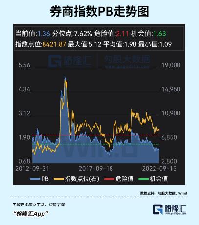券商板块从2020年7月有过一波小牛行情外,一路下泄至今,跌幅高达35%以上。跌了2年多,只有东方财富是个意外,从去年12月才开始回撤。现在,券商指数PB已经跌至1.36倍,位于10年估值下线区间,仅仅略高于至暗时刻的2018年年底。