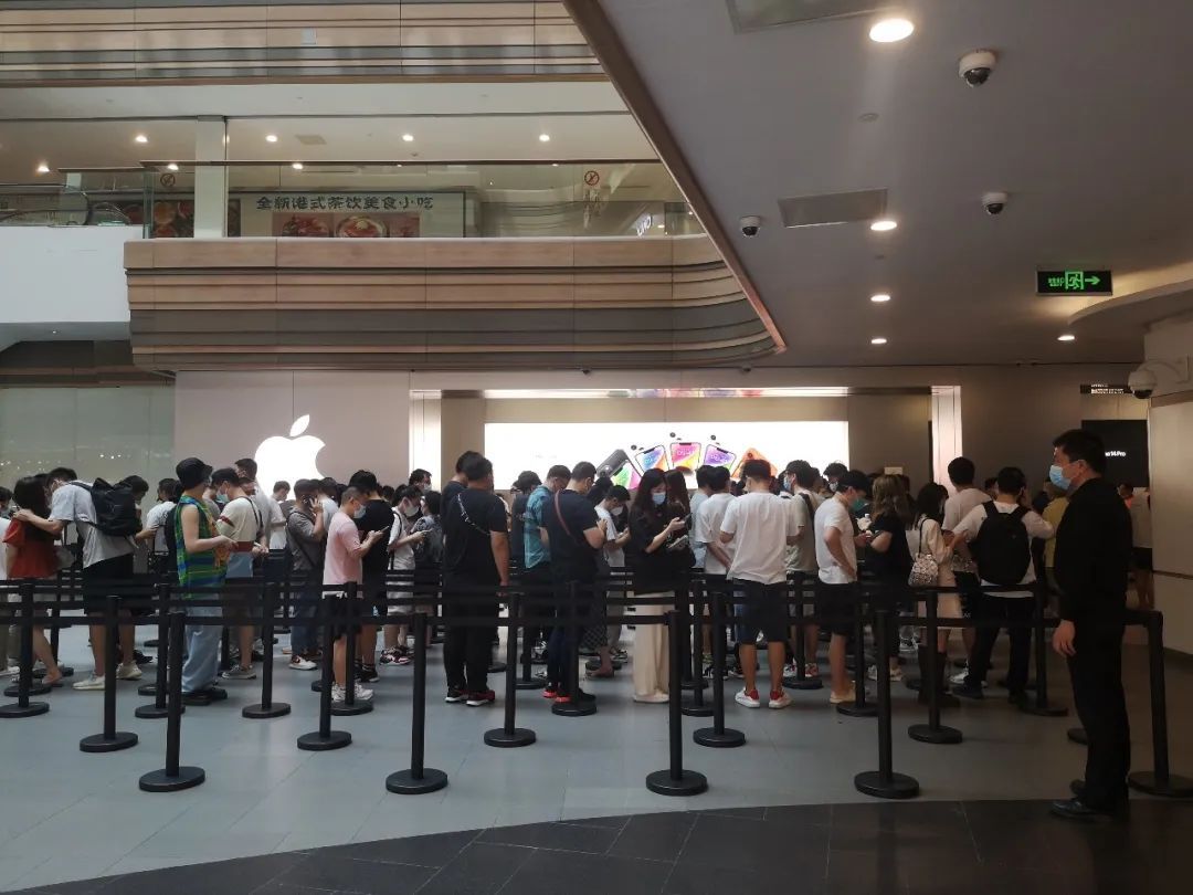 9月16日早上9点半,《IT时报》记者来到苹果上海南京东路直营店时,已经排起长龙,目测将近50人,店内更是人山人海。为了维护秩序,苹果店特意分出提货与参观两条排队通道,连店内也拉起了隔离带,引导顾客有序前往样机展示台。