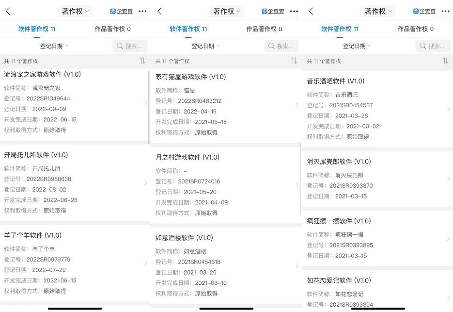 但即便成功了两次,小微游戏仍然比中重度游戏更缺乏规律可循。知识产权信息显示,简游科技公司十余项游戏软件著作权已获得登记批准,其中包括《解救大西瓜》《疯狂擦一擦》等,但真正出圈的只有《羊了个羊》。