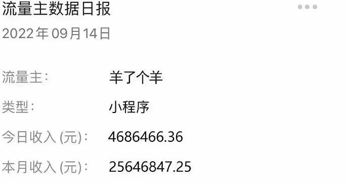 流量主数据日报显示,《羊了个羊》仅9月14日一天就赚了将近500万( 马化腾表示:核实了是ps伪造的) 。 这给玩家带来的冲击更胜“抄袭”。有不少人甚至不知道,原来自己为了过关看广告,开发团队就能获得真金白银的收入。