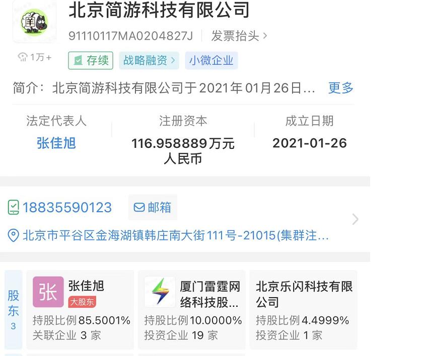 《羊了个羊》的开发商北京简游科技有限公司,是一家成立于2021年的年轻公司,由张佳旭、厦门雷霆网络科技股份有限公司、北京乐闪科技有限公司共同持股,注册资本116万,参保人数7人,是货真价实的小微企业。