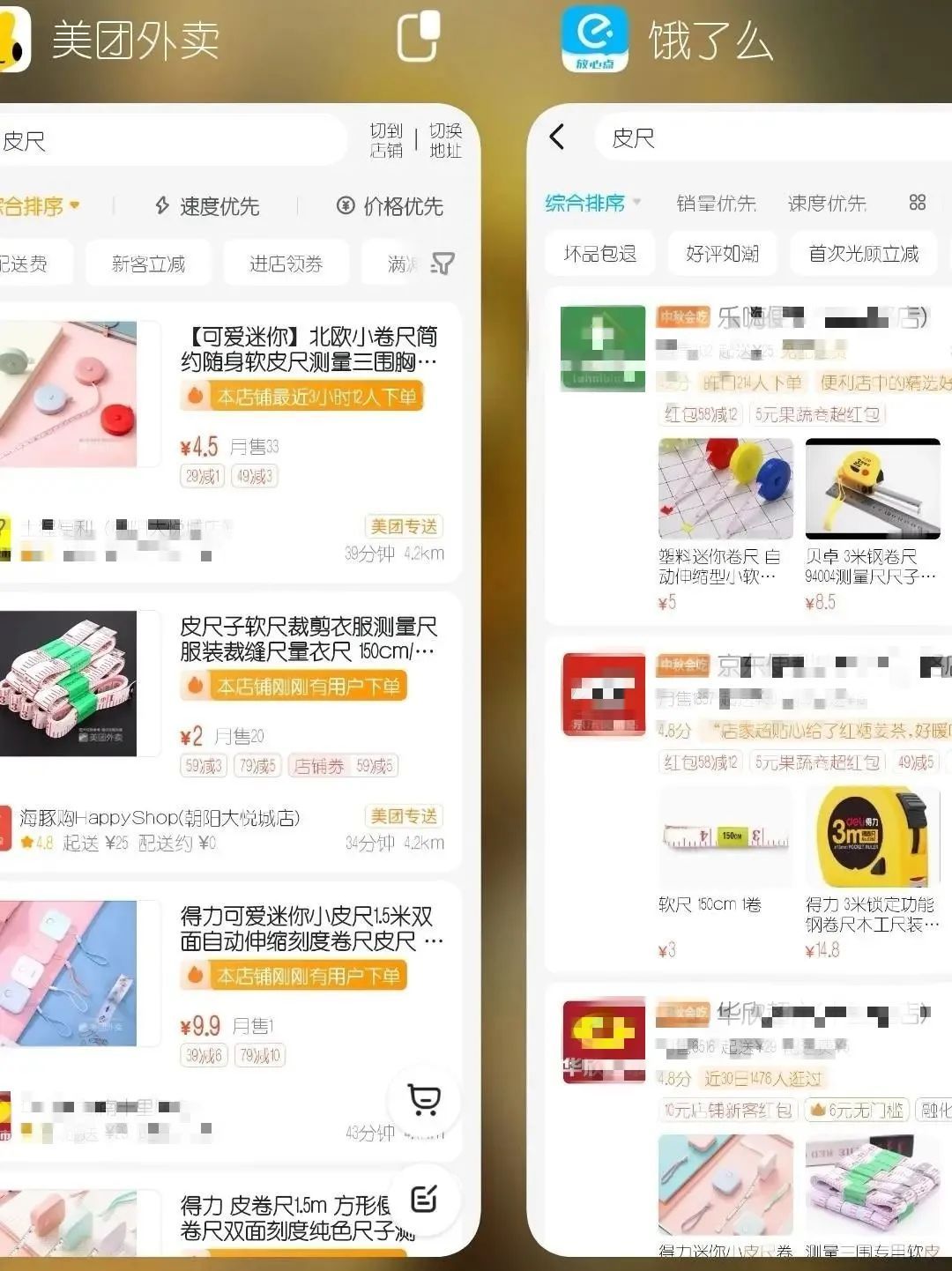 图/秋秋在美团外卖、饿了么分别搜索“皮尺”得到的结果