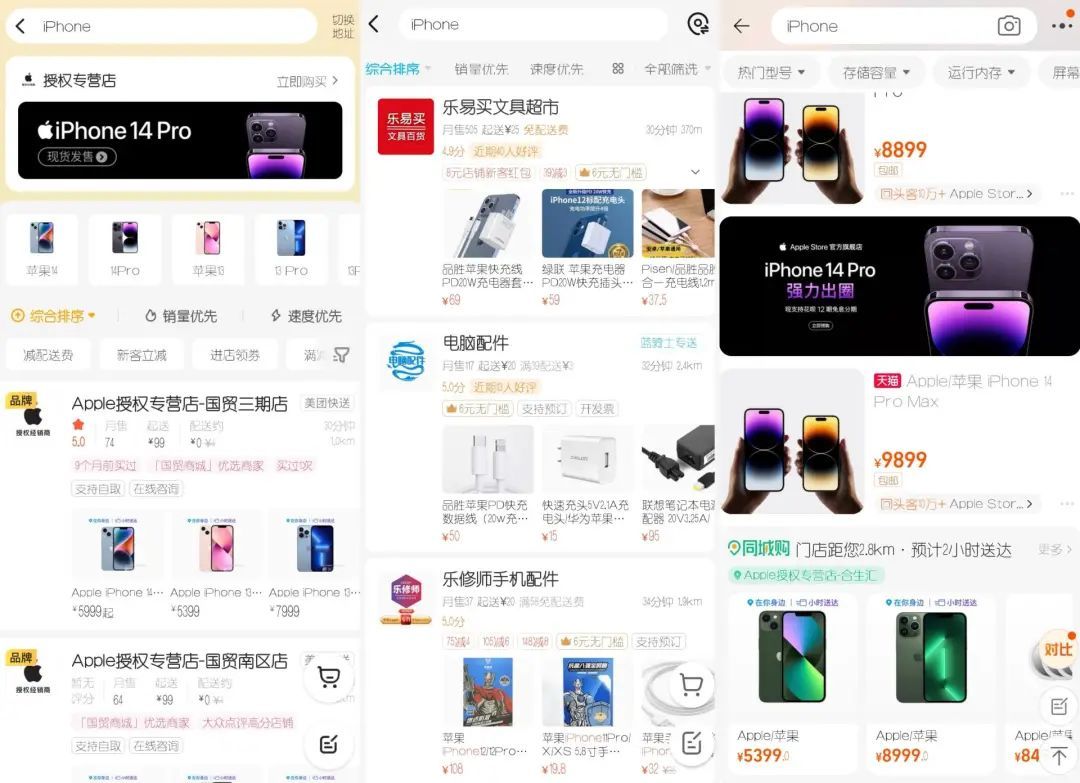 在美团外卖、饿了么、淘宝搜索“iPhone”的结果
