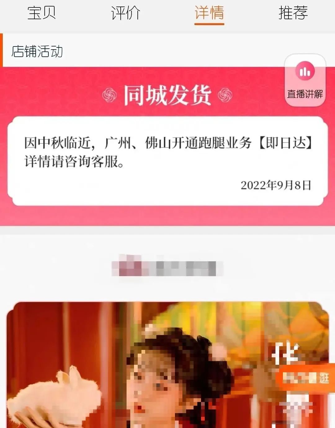 该商品详情页表示,“因中秋临近,广州、佛山开通跑腿业务【即日达】,详情咨询客服。”