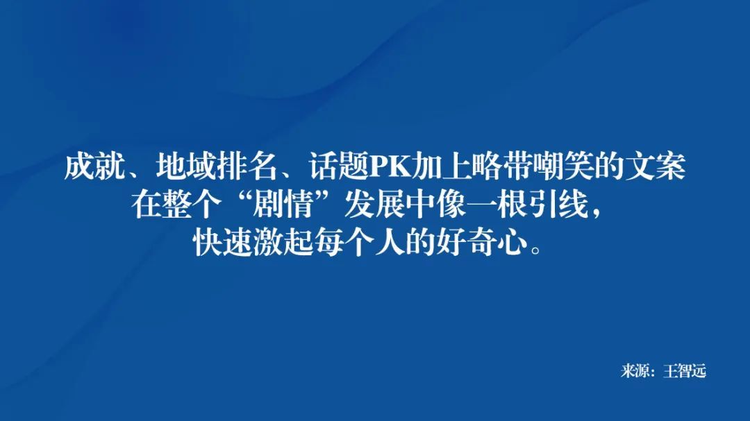 一言撇之,成就排名、地域排名、话题PK加上略带嘲笑挑衅式的文案在整个“剧情”发展中像一根引线,快速激起每个人的“好奇心”,都试图研究通关后,到底会得到什么奖励。