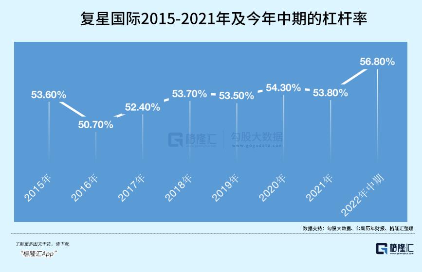 根据复星国际的计息债务/总资本所得的杠杆率显示,自2015年-2021年及2022年上半年,公司杠杆率分别为53.6%、50.7%、52.4%、53.7%、53.5%、54.3%、53.8%、56.8%。