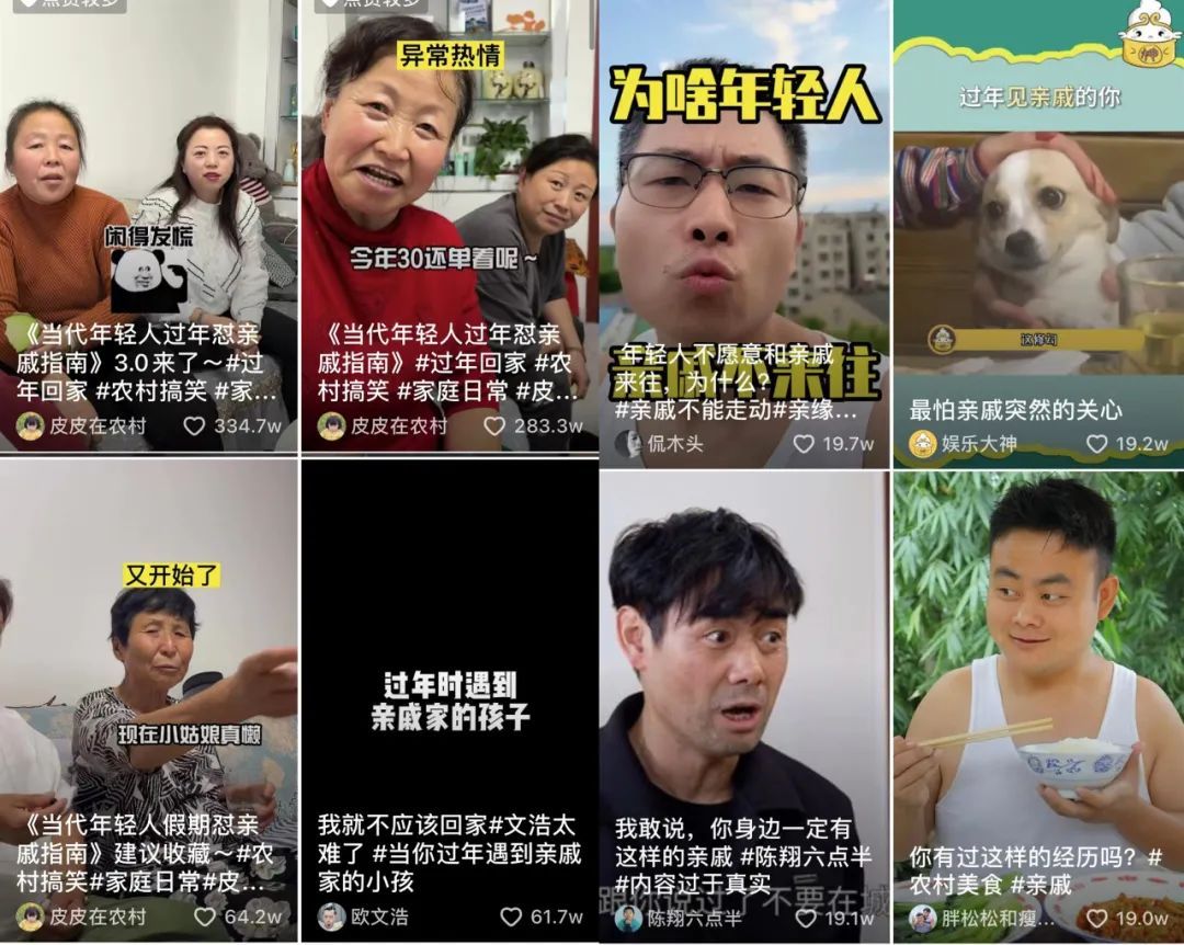 他们和亲戚不熟,但是却知道拿亲戚的话题,去换共情的流量。在社交平台随意检索“亲戚”相关的视频,播放、互动都是十分给力。
