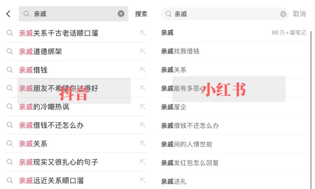 打开短视频品牌,社交网站,我们搜索“亲戚”,网友们关心的话题都是“亲戚找我借钱”“亲戚道德绑架”“亲戚的冷嘲热讽”……的负面讨论。